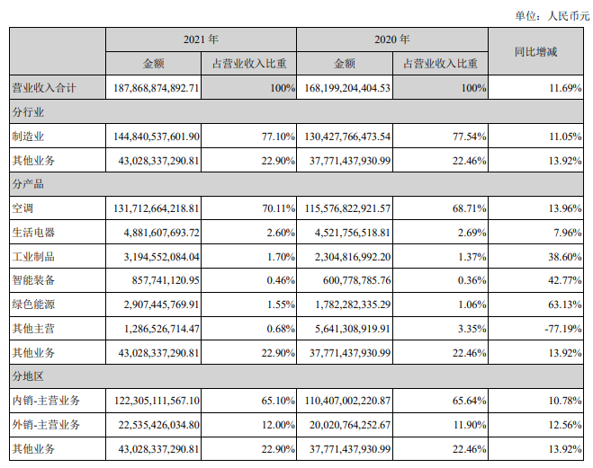 根據格力電器2021年財報顯示,公司2021年營業收入1878.69億元,同比增長11.69%;實現歸母凈利潤230.64億元,同比增長4.01%。其中智能裝備8.58億元,同比增長42.77%。