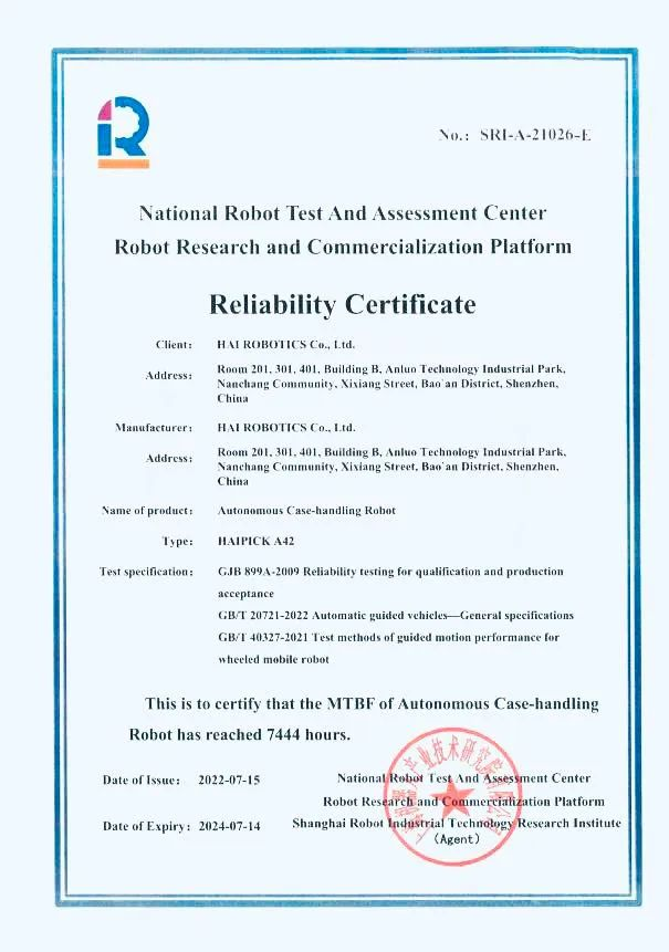 近日,海柔創新 HAIPICK A42 箱式倉儲機器人順利通過上海機器人產業技術研究院的 MTBF 5000小時測評,獲得ACR(箱式倉儲機器人)領域首張MTBF 5000小時可靠性證書。