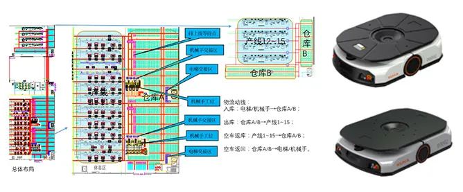 該鈑金生產工廠,制造車間共分兩大庫區,共計15條產線,600+庫位,現場需融合機械臂生產入庫,采用水墨屏數字化管理,并部署AMR自主移動機器人搬運料車自動入庫、配送至產線,同時使用RFID技術實現智能物料盤點,最終實現兩大庫區內的智能化高效生產。