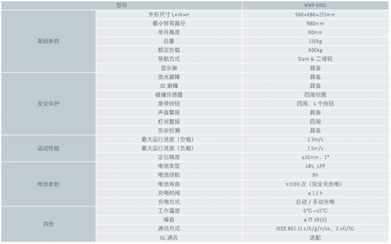 KMP 600I是基于德國先進的激光Slam導航技術打造的全新AMR產品,以智能靈活、穩定高效、安全可靠為特征,賦能客戶智慧物流、智能制造升級,可廣泛應用于3C電子、新能源、汽車、白色家電、醫藥、一般工業、電商物流等行業。