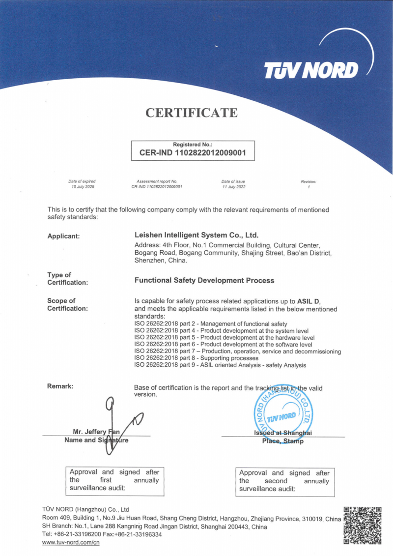 核心提示:7月14日,鐳神智能獲得由TüV NORD 頒發(fā)的ISO 26262:2018汽車功能安全流程認(rèn)證證書,且獲得ASIL D最高等級認(rèn)可!(ASIL有四個等級,分別為A、B、C、D,其中 D是要求最嚴(yán)苛的等級)。