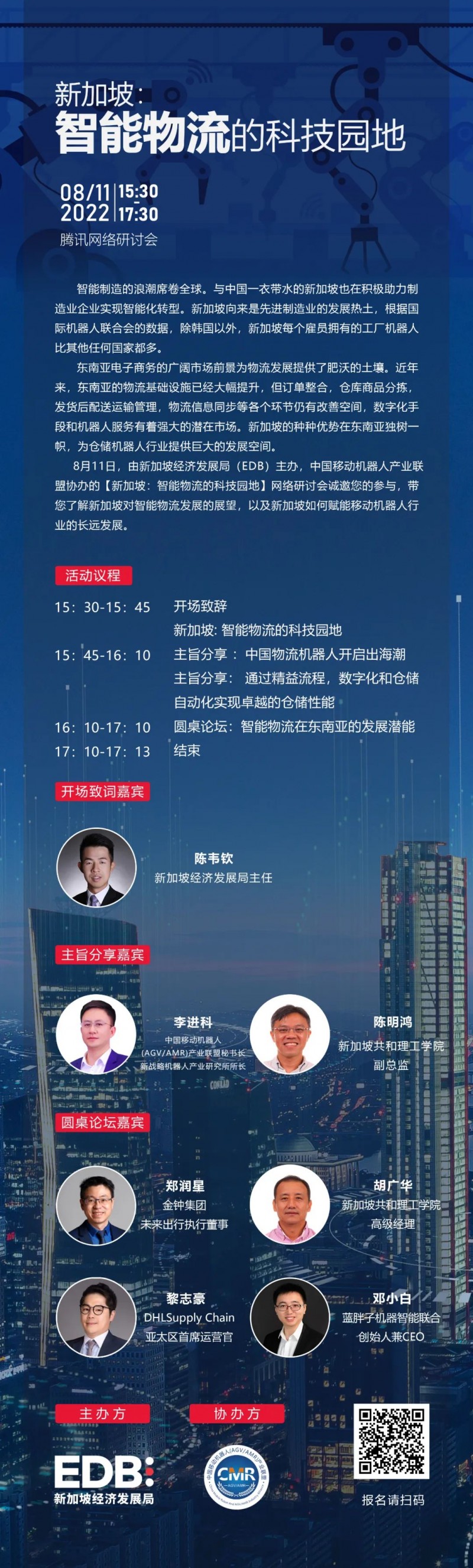 本次研討會將帶您了解新加坡對智能物流發展的展望,以及將如何賦能移動機器人科技行業的長遠發展,為中國的企業帶來更多國際化機遇,滿足物流倉儲科技創新的發展需求。