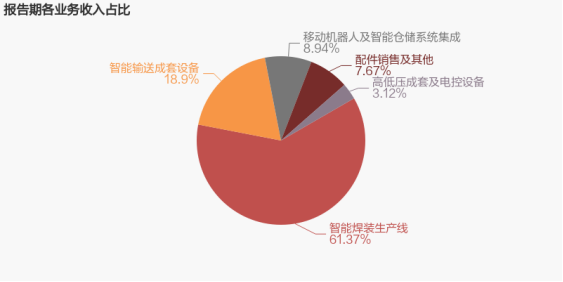 從業務結構來看,“智能焊裝生產線”是公司營業收入的主要來源。具體而言,“智能焊裝生產線”營業收入為4.18億元,營收占比為61.4%,毛利率為13%。