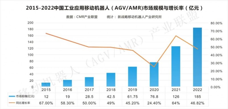根據CMR產業聯盟數據,新戰略移動機器人產業研究所統計,2022年度,中國工業應用移動機器人(AGV/AMR)銷售數量93000臺(含銷往海外市場),較2021年增長29.17%,市場規模達到185億元,同比增長46.82%。