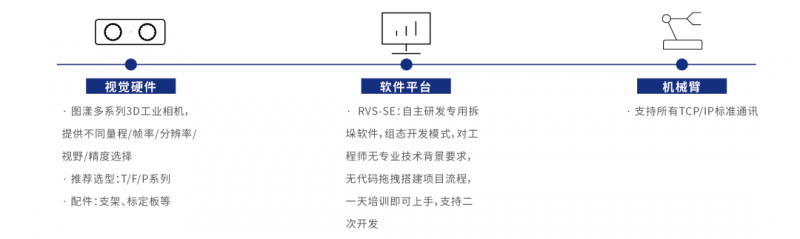 圖漾3D視覺引導軟包拆垛方案主要由圖漾核心自主專利的3D工業相機、深度學習算法及RVS-SE軟件、機械臂(可選)、工業PC等共同構成。