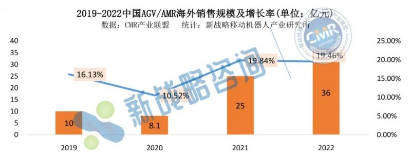 2019-2022中國AGV/AMR海外銷售規(guī)模及增長率(單位:億元)