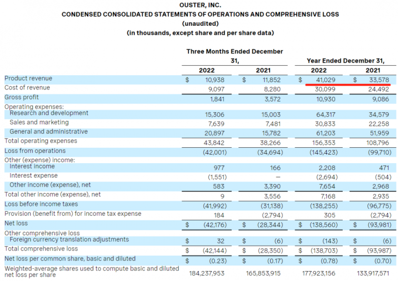 Ouster實現2022年的指導目標,報告全年收入增長22%。2022年全年財務摘要:實現了2022年的指引,收入為4100萬美元,毛利率為27%。2022年與新客戶和現有客戶簽訂了7000萬美元的業務。2022年發貨的傳感器超過8650個,迄今發貨的傳感器總數超過18500個。2022年凈虧損增加到1.39億美元,而2021年為9400萬美元。