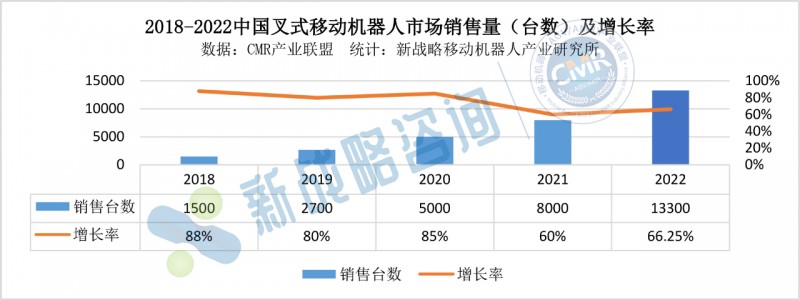 據(jù)CMR產(chǎn)業(yè)聯(lián)盟數(shù)據(jù)、新戰(zhàn)略移動(dòng)機(jī)器人產(chǎn)業(yè)研究所統(tǒng)計(jì),2022年中國(guó)叉式移動(dòng)機(jī)器人銷(xiāo)量達(dá)13300臺(tái),同比增長(zhǎng)66.25%,市場(chǎng)規(guī)模約為34.68億元,同比增長(zhǎng)41.55%。