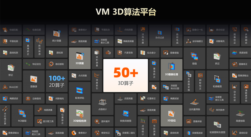 VM 3D算法平臺是專門為3D高精度定位、測量、缺陷檢測設(shè)計開發(fā)的平臺級軟件,基于圖形化交互、流程式編輯和可視化配置的框架特性,為用戶提供功能豐富、操作便捷的軟件方案開發(fā)平臺。