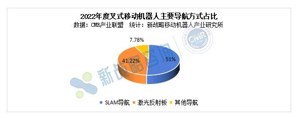 根據(jù)CMR產(chǎn)業(yè)聯(lián)盟數(shù)據(jù),新戰(zhàn)略移動機器人產(chǎn)業(yè)研究所統(tǒng)計,2022年,SLAM導(dǎo)航(激光+視覺)的無人叉車占比首次超過了激光有反射板叉車,成為市場應(yīng)用主流,占比為51%,激光反射板無人叉車增速不如SLAM導(dǎo)航產(chǎn)品,占比下降,為41.22%。