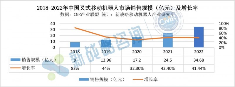 圖表:2018-2022年中國叉式移動機器人市場銷售規(guī)模(億元)及增長率