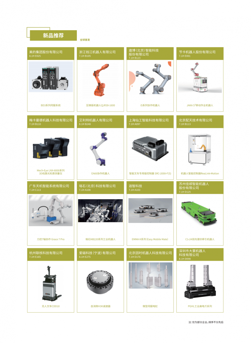 新品覆蓋了工業(yè)機(jī)器人本體、SCARA機(jī)器人、DELTA機(jī)器人、協(xié)作機(jī)器人、AGV/AMR、移動(dòng)復(fù)合機(jī)器人、減速器控制器傳感器和伺服電機(jī)執(zhí)行器等核心零部件、軟件及系統(tǒng)集成應(yīng)用等,彰顯最前沿的機(jī)器人技術(shù),為新型工業(yè)化注入新動(dòng)能。