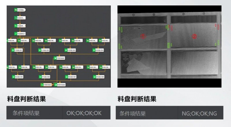 針對(duì)搭邊缺陷檢測(cè),基于相機(jī)采集的深度圖像,導(dǎo)入VM 3D軟件中,依據(jù)mark點(diǎn)定位到每個(gè)料盤(pán)的四個(gè)角點(diǎn),分別在角點(diǎn)料坑上下曲小區(qū)域計(jì)算均值,可取四對(duì)或八對(duì)區(qū)域,比對(duì)料坑上下高度差值,正值為OK(綠色非搭邊框),負(fù)值為NG(紅色搭邊框)。