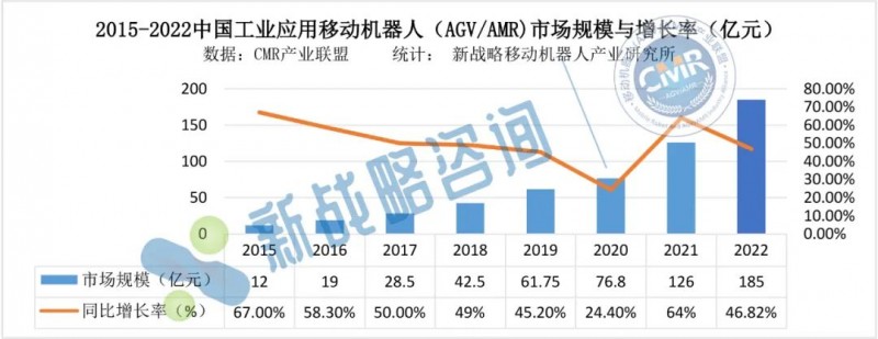 2015-2022中國工業(yè)應用移動機器人(AGV/AMR)市場規(guī)模與增長率