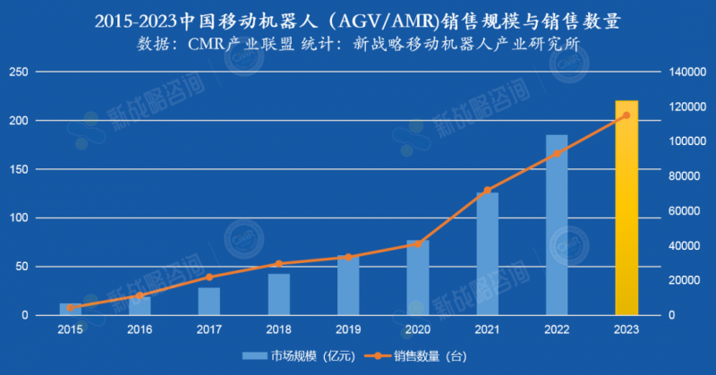 根據(jù)新戰(zhàn)略移動機器人產(chǎn)業(yè)研究所初步測算,預(yù)計2023年中國移動機器人(AGV/AMR)銷售規(guī)模約為220億,同比增長18.9%;銷售數(shù)量約為115000臺,同比增長23.7%。