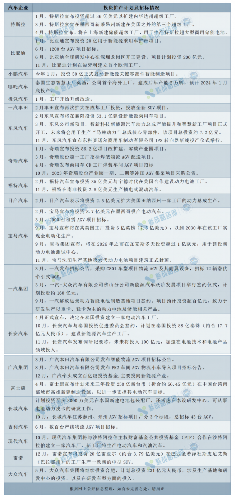 在新能源汽車領域,自主品牌的優勢更為明顯。根據2023年前11月的數據,除特斯拉外,新能源領域銷量前十名的廠商均為自主品牌。自主品牌在新能源市場和出口市場獲得明顯增量,頭部傳統車企轉型升級表現優異,比亞迪、奇瑞、長安、吉利等汽車品牌份額提升明顯。比亞迪作為新能源汽車領域的頭部企業,今年相繼公布了多個投資擴廠計劃,其中包括一些海外項目,對AGV的需求巨大。