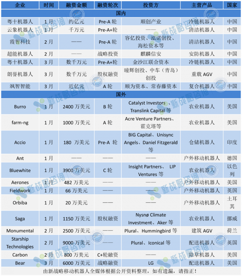 從時間分布來看,Q1全球移動機器人融資事件發(fā)生集中在1月,融資事件11起,融資總額約7.7億元;2月出現(xiàn)較多大筆融資,融資事件5起,資金總額約9.1億元;3月融資數(shù)量和融資金額均有所回落,融資數(shù)量4起,融資總額約5.5億元。