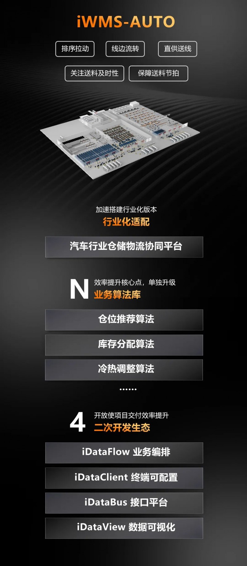針對(duì)汽車行業(yè)特性打造的倉儲(chǔ)物流協(xié)同平臺(tái),通過排序拉動(dòng)、線邊流轉(zhuǎn)、直供送線等方式保障每個(gè)工位的送料節(jié)拍。