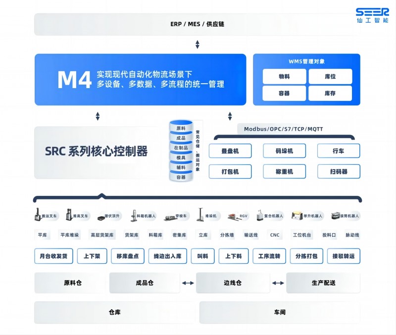 M4 集成 RCS、WCS、WMS 功能于一身,一體化管理解決機器人管理與運單管理問題、各類與機器人配合作業(yè)的自動化設備管理問題、入庫出庫等倉儲業(yè)務問題,降低系統(tǒng)對接及維護成本,打破多系統(tǒng)間的數(shù)據(jù)孤島。