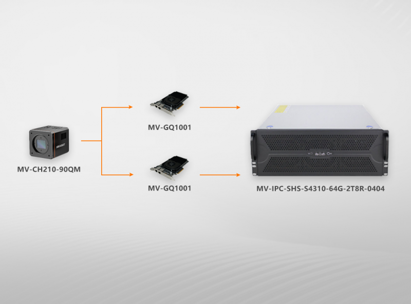 方案采用CH系列2100W分辨率/540幀面陣相機,通過2張50G單口光口卡GQ1001,將所有原圖數(shù)據(jù)同步傳輸至14GB/s連續(xù)寫入性能,16TB容量的SHS系列高速讀寫服務(wù)器中。