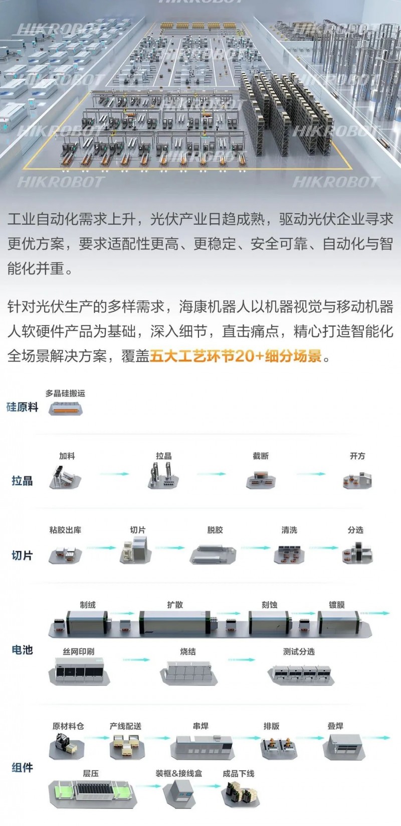 目前海康機器人已與包括通威、隆基、晶科在內(nèi)的多家光伏頭部企業(yè)在智能制造方面進行合作。智能化全場景解決方案在諸多光伏項目中落地應用。
