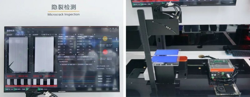 其中,隱裂檢測方案使用“4k黑白線陣相機+大靶面短波紅外鏡頭+穿透式近紅外線激光光源”,可對0.5mm以上尺寸的脫晶、崩邊、破片、隱裂以及疊片、臟污進行檢出與分類;在數據處理上,采用了新發布的SVA智能視覺處理卡方案,將軟件的大部分傳統算法與深度學習檢測模塊轉入這張采集卡內工作,極大降低了工控機的硬件資源占用。