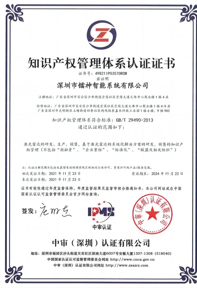 鐳神智能對技術專利的申請與保護持有極高的重視度。公司不僅成功取得了知識產權管理體系認證,更憑借其卓越的表現,榮獲廣東省知識產權示范企業的稱號,同時被評為深圳市知識產權優勢單位。這些榮譽充分體現了鐳神智能在知識產權保護方面的領先地位和不懈努力。