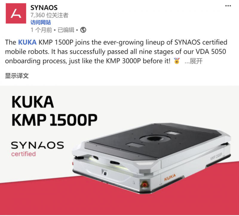 德國SYNAOS公司為世界著名的工業(yè)物流系統(tǒng)開發(fā)集成商。SYNAOS調(diào)度系統(tǒng)采用了現(xiàn)今工業(yè)物流領(lǐng)域主流的VDA 5050 協(xié)議。在SYNAOS公司嚴(yán)格的質(zhì)量要求下,KMP 1500P在實(shí)現(xiàn)了VDA 5050標(biāo)準(zhǔn)協(xié)議的同時(shí),依次通過了SYNAOS 9步質(zhì)量檢測,達(dá)到了認(rèn)證標(biāo)準(zhǔn),現(xiàn)已成為SYNAOS集成項(xiàng)目中可靠的組成部分,并且可以應(yīng)用到更多行業(yè)領(lǐng)域賦能其內(nèi)部物流升級(jí)。