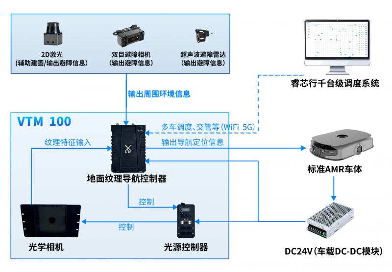 VTM 100(Visual Texture Module)是睿芯行推出的基于視覺的地面紋理導(dǎo)航模組。該模組由光學(xué)相機(jī)和地面紋理導(dǎo)航控制器組成,通過光學(xué)相機(jī)輸出地面紋理特征,搭配地面紋理導(dǎo)航控制器產(chǎn)品實(shí)現(xiàn)無需地面任何標(biāo)識(shí)物,輸出定位信息。可支持瓷磚、水泥、金剛砂等材質(zhì)地面,實(shí)現(xiàn)基于視覺地面紋理的導(dǎo)航定位。VTM100是標(biāo)準(zhǔn)化模組,可基于客制多款A(yù)MR標(biāo)準(zhǔn)車型,快速形成地面紋理導(dǎo)航AMR整車產(chǎn)品,可支持最高速度2m/s,定位精度±5mm,場景無憂,無懼白天黑夜。