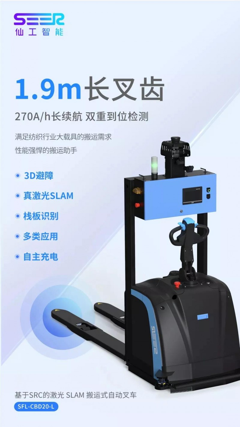 在SFL-CBD20-S的基礎上,仙工智能升級打造了一款紡織行業(yè)專用大載具激光SLAM自動叉車——SFL-CBD20-L,該款產(chǎn)品具有長叉齒、長續(xù)航的特性,加配雙重到位開關,能夠輕松解決紡織行業(yè)物料車裝載不規(guī)則的搬運難題,一次性滿足大載具搬運需求。