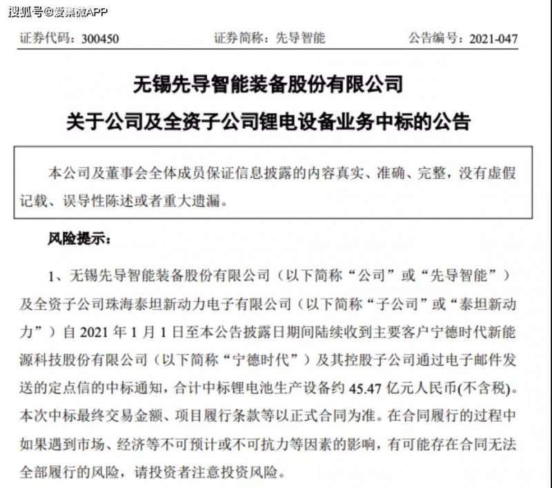5月31日晚間,無錫先導智能裝備股份有限公司(簡稱“先導智能”)發布公告稱,先導智能及全資子公司泰坦新動力自2021年1月1日至公告披露日期間陸續收到主要客戶寧德時代新能源科技股份有限公司(以下簡稱“寧德時代”)及其控股子公司通過電子郵件發送的定點信的中標通知,合計中標鋰電池生產設備約45.47億元人民幣。