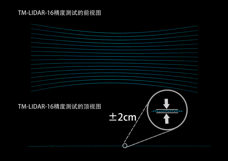 TM-LIDAR-16采用脈沖測距法,能抗強光干擾,且誤差大小受量程影響較小,在150米以內(nèi),墻面精度控制在±2cm。
