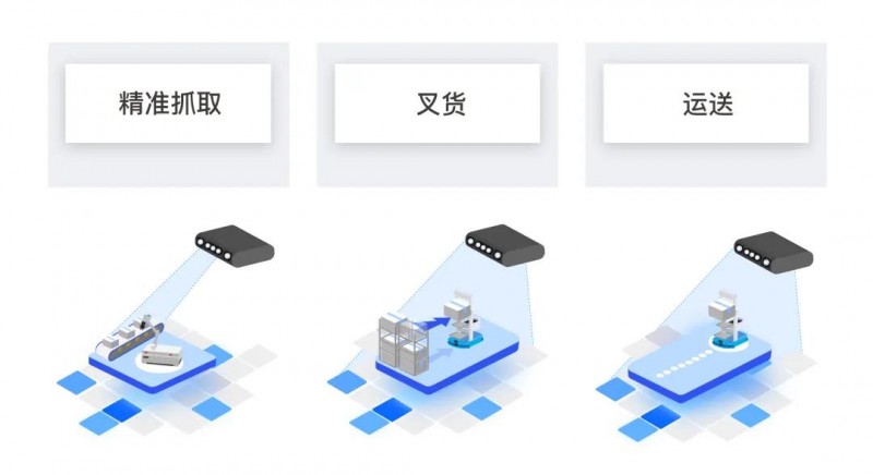 在產線上,RoboView Server 能夠連接多種不同類型的相機,如使用激光相機拍攝視野中任意位置的貨物,對獲取到的 3D 點云,運用點云算法識別、定位算法精確(最高可精度達到0.1mm)的計算出產品的位姿和外形尺寸信息,并發送給機械臂或 AGV,精準抓取、 裝包或叉貨、運送的任務,或是智能引導涂膠等