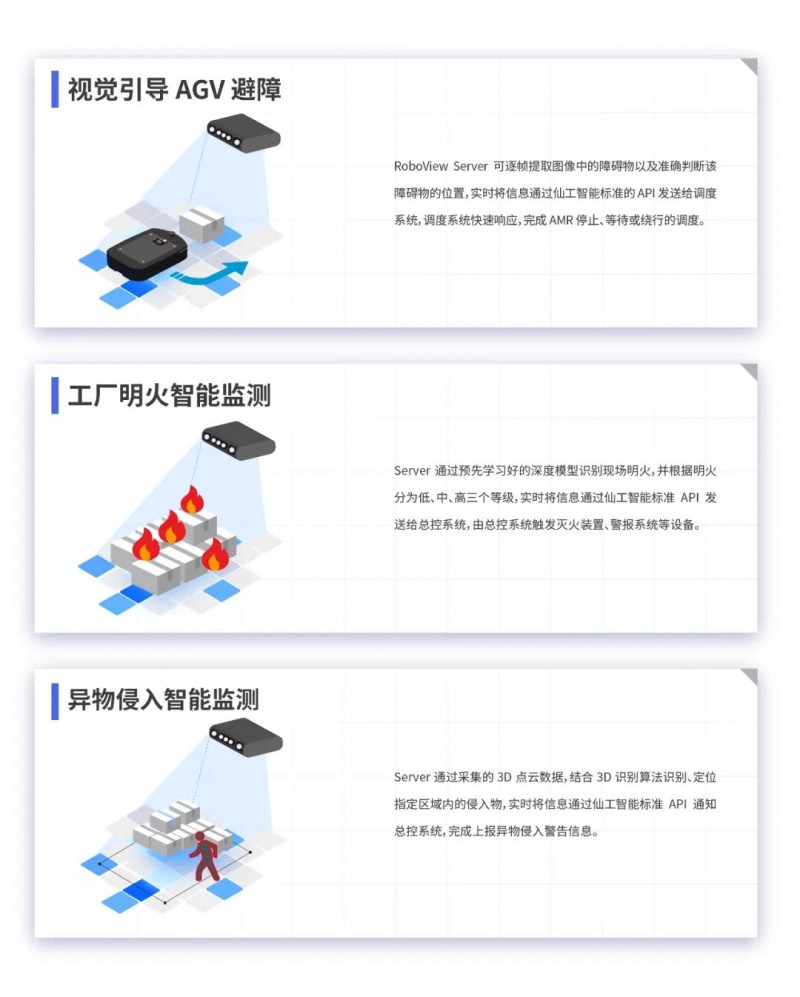 RoboView Server 通過攝像頭實時采集的現場視頻,經過不同的視覺算法判斷現場情況,實時 通過仙工智能標準 API 發送給對應的調度系統或總控系統,以確保工作、生產安全進行。
