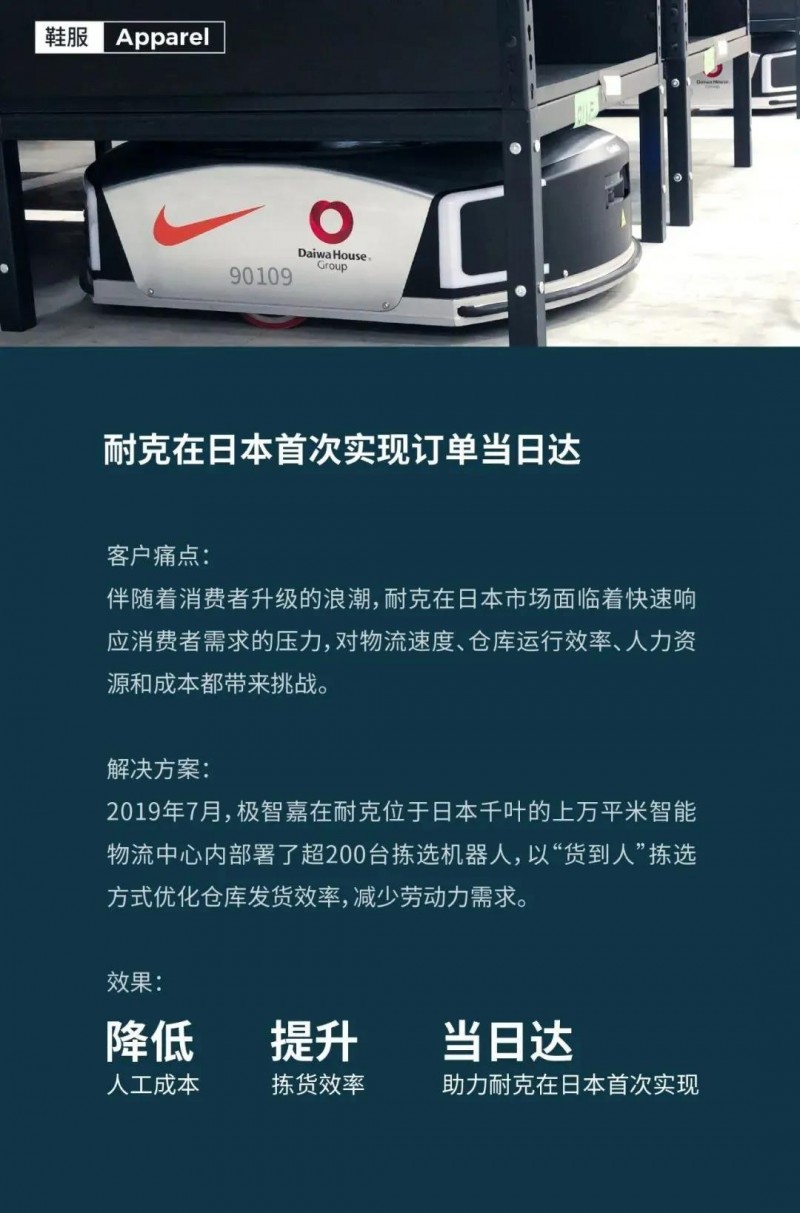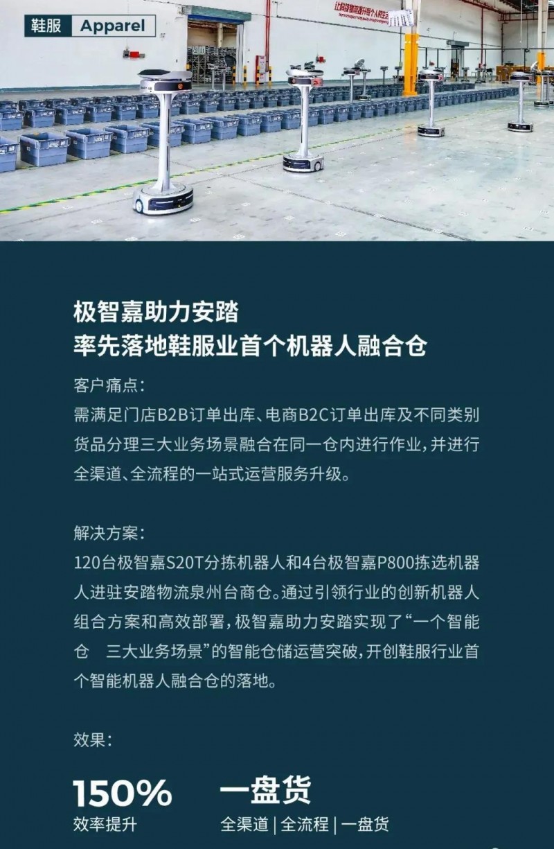 作為在鞋服行業(yè)擁有深厚行業(yè)積淀的智能物流方案專家,極智嘉已成功賦能耐克、安踏等行業(yè)龍頭品牌,實(shí)現(xiàn)物流智能升級(jí),不斷助力客戶以數(shù)字化、精細(xì)化的倉(cāng)配運(yùn)營(yíng)管理,連接碎片化、多邊化場(chǎng)景,提升消費(fèi)者購(gòu)物體驗(yàn)。