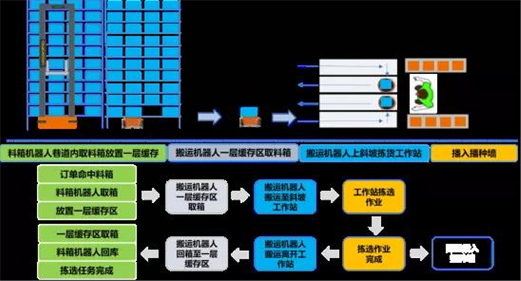 “大工”鴻鵠料箱機(jī)器人主要干“蓋樓”的活,系統(tǒng)下達(dá)命令后,鴻鵠負(fù)責(zé)垂直方向的取貨,然后放在一層的緩存架;接下來,由體積小巧靈活的“小工”青鸞干“搬磚”的活,負(fù)責(zé)水平方向上遠(yuǎn)距離的料箱搬運(yùn),背負(fù)料箱送至工作站。人只需要從料箱內(nèi)揀貨即可。
