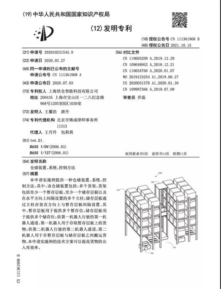 快倉Quick Pick方案以其先進(jìn)性和創(chuàng)新性獲得了行業(yè)內(nèi)外的一直認(rèn)可,20211015日快倉QuickPick發(fā)明專利獲得正式授權(quán)!