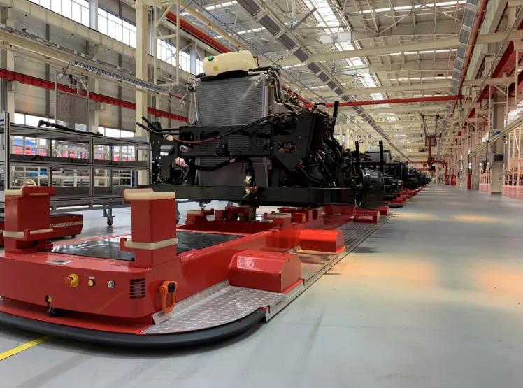 客戶為國內(nèi)某著名工程機械廠商,本項目由CSG華曉為其量身定制的91臺AGV, 主線配備43臺大型定制裝配AGV,單臺承重超過10T,可實現(xiàn)1m/min~30m/min無級變速。相比傳統(tǒng)的拖鏈裝配線來說,AGV裝配線具有路線可調(diào)整,工位可擴展,投資更靈活的優(yōu)勢。除了主線的提升以外,物流自動化同步改善,37臺SPS的潛伏牽引AGV自動匹配主線運行狀態(tài),按單臺份定量配貨,解放線邊庫存空間的同時又提升了裝配的準確率。另外,5臺平衡懸架、前中后橋分裝頂升背負AGV,7臺發(fā)動機分裝后牽引AGV,24臺駕駛室分裝潛伏式牽引AGV,統(tǒng)籌協(xié)作實現(xiàn)全廠區(qū)內(nèi)物流轉(zhuǎn)運的無人化。