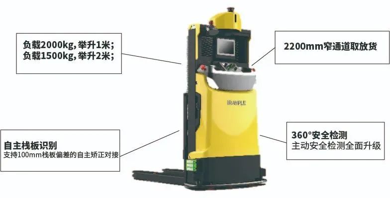 華睿科技推出F150A系列窄通道叉取型AMR。F150A系列叉取型AMR基于窄體車身設(shè)計,可以在2200mm通道內(nèi)將最大2000kg貨物堆高1米,滿足窄通道內(nèi)的大負載搬運和機臺對接作業(yè)。也可以將1500kg貨物堆高至2米,滿足貨物的轉(zhuǎn)運和上架存儲。