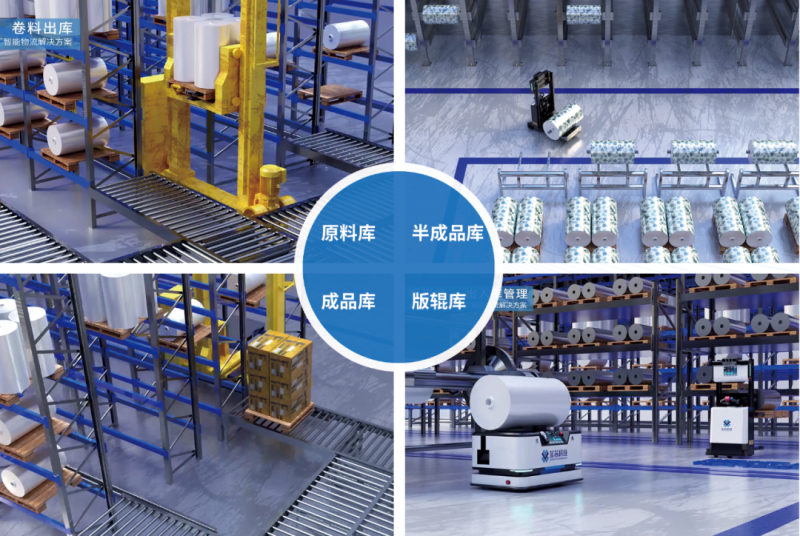 針對以上痛點,藍芯科技以智能拆包裝置、打橫裝置、上下料機器人、無人叉車、搬運機器人、分切下料打包自動線為主體,結合智能倉儲設備、信息化管理系統,實現包裝企業來料自動拆包、物料自主搬運、卷料自動上/下料、庫位自動識別、成品/半成品/原料自動出入庫作業。