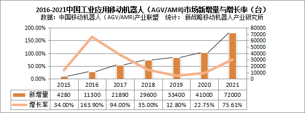 圖表:2015-2021中國市場企業(yè)工業(yè)應(yīng)用移動(dòng)機(jī)器人(AGV/AMR)新增量(臺)與增長率