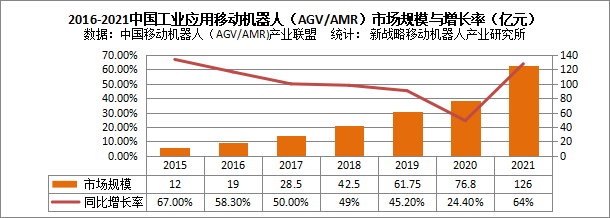 圖表:2015-2021中國工業(yè)應(yīng)用移動(dòng)機(jī)器人(AGV/AMR)市場規(guī)模(億元)與增長率